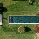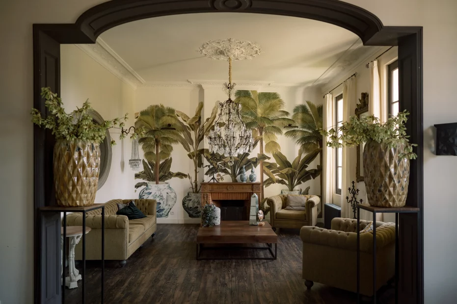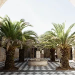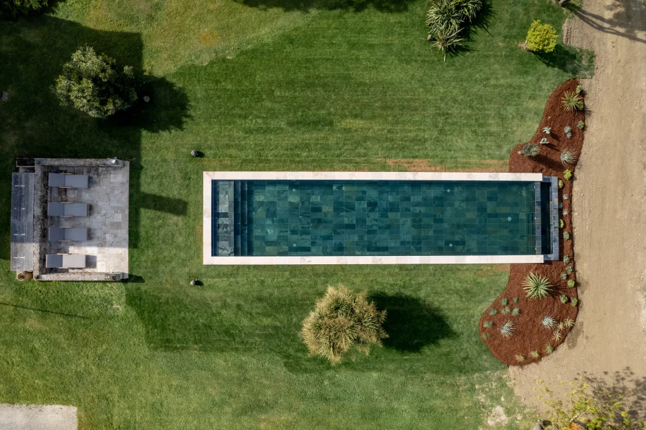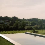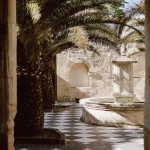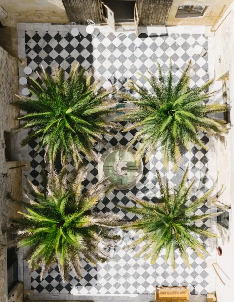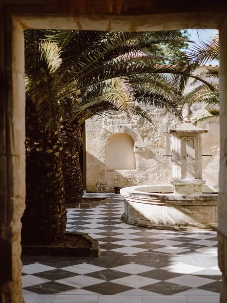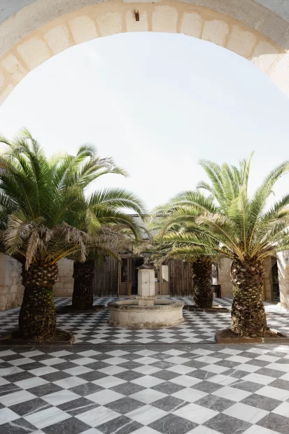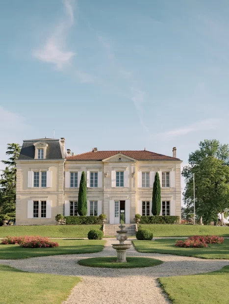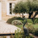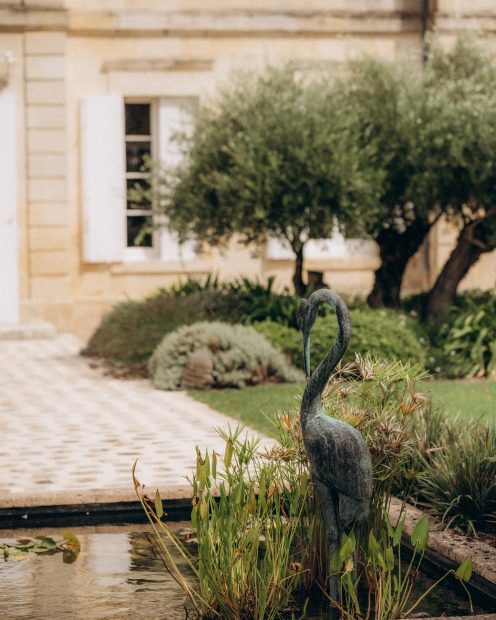 One of the most memorable corners of the estate is the patio – framed by four tall palm trees, a central fountain and a striking black and white chequered floor. It has a slightly unexpected feel for Bordeaux, almost Mediterranean in mood, and makes a beautiful setting for drinks, dinner or dancing beneath the evening sky.