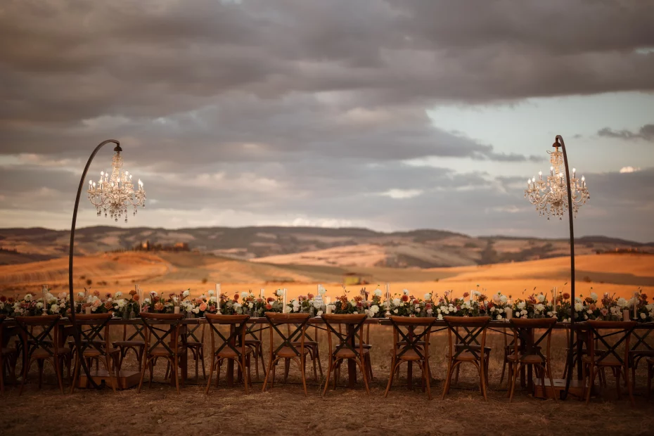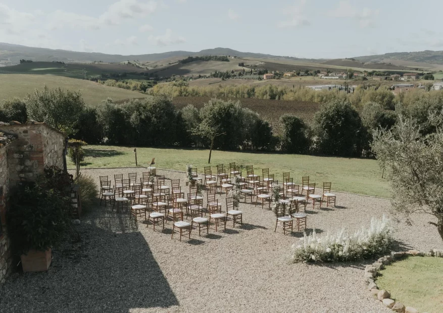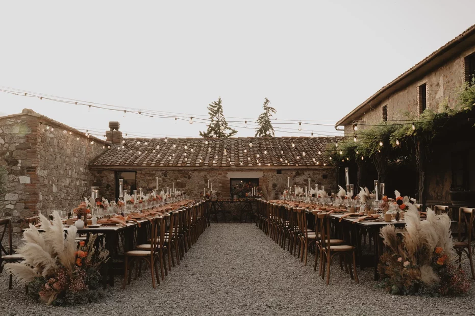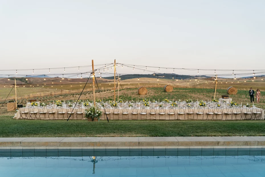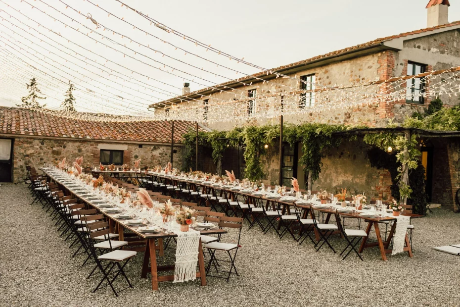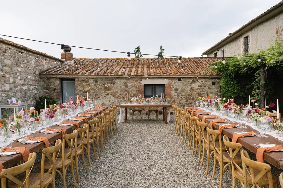 Weddings here unfold naturally. Ceremonies for up to 120 guests feel generous yet connected to the landscape, with the surrounding Tuscan hills providing an effortless backdrop. From there the celebration flows easily into the reception, with long tables, open air moments and a rhythm shaped by the pace of the countryside itself. The day never feels overly structured; instead, it moves with the relaxed elegance that defines the region.