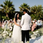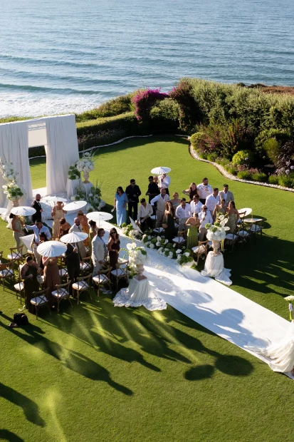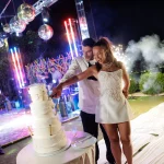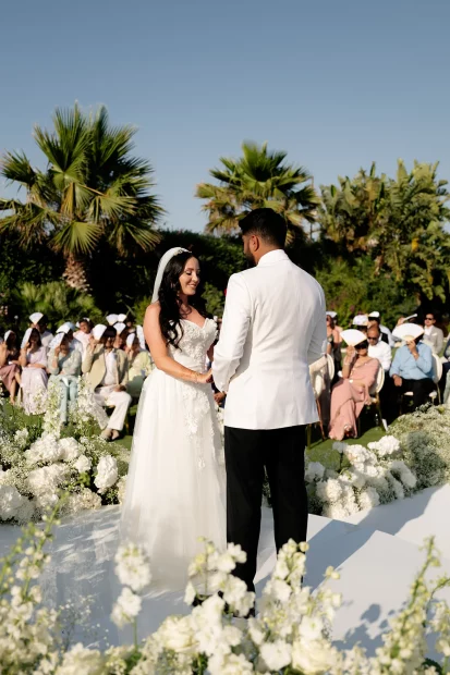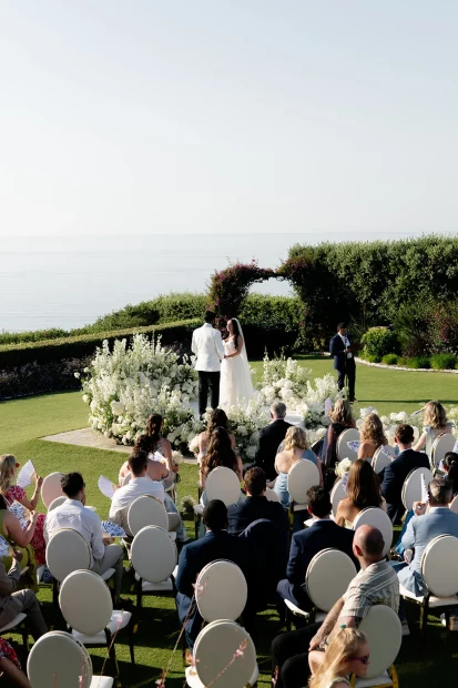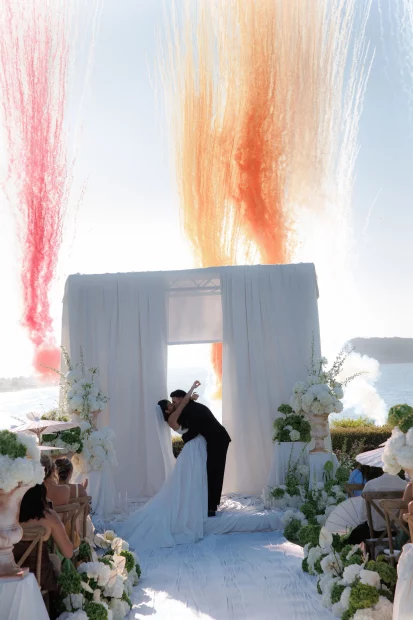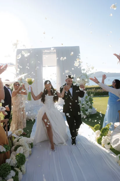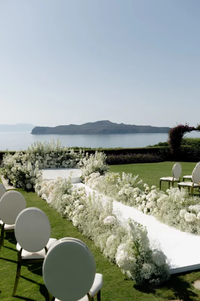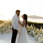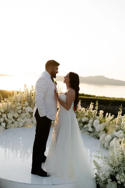 That golden-hour ceremony moment. As the sun melts into the Aegean and the sky turns blush pink, youโll exchange vows with a sea breeze in your hair and the island stretching out below you. Itโs pure, cinematic romanceโand makes for the kind of wedding photos youโll frame forever.