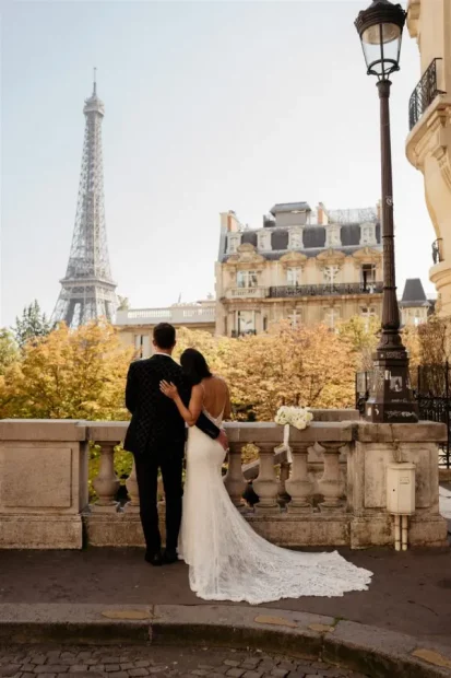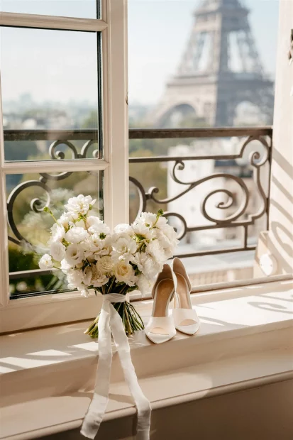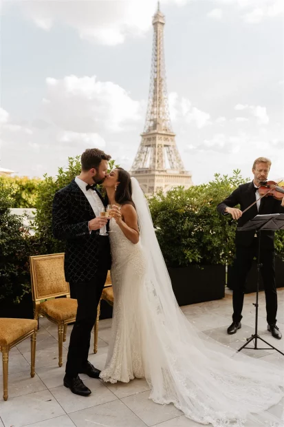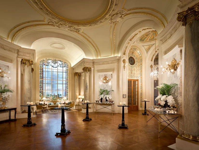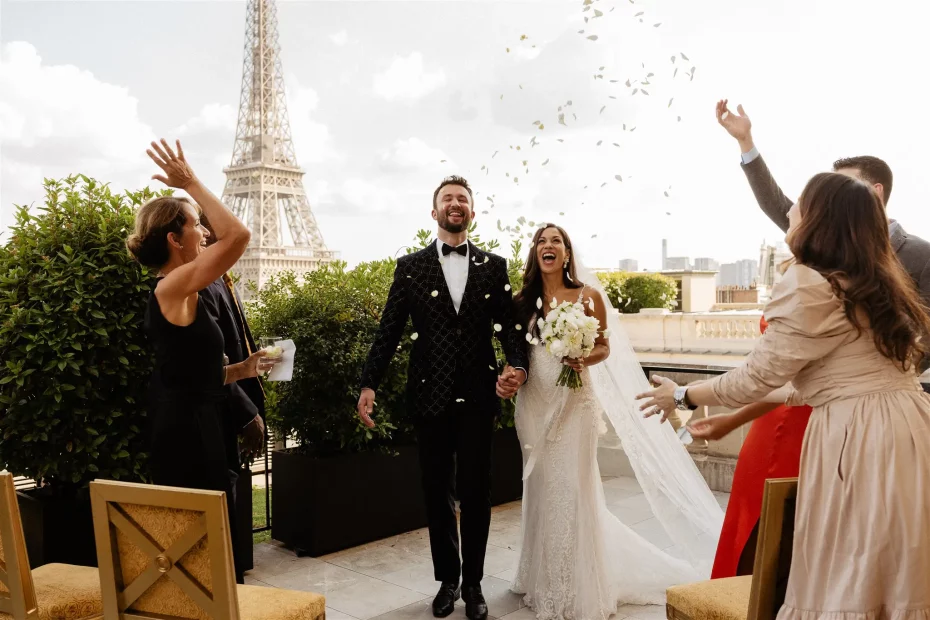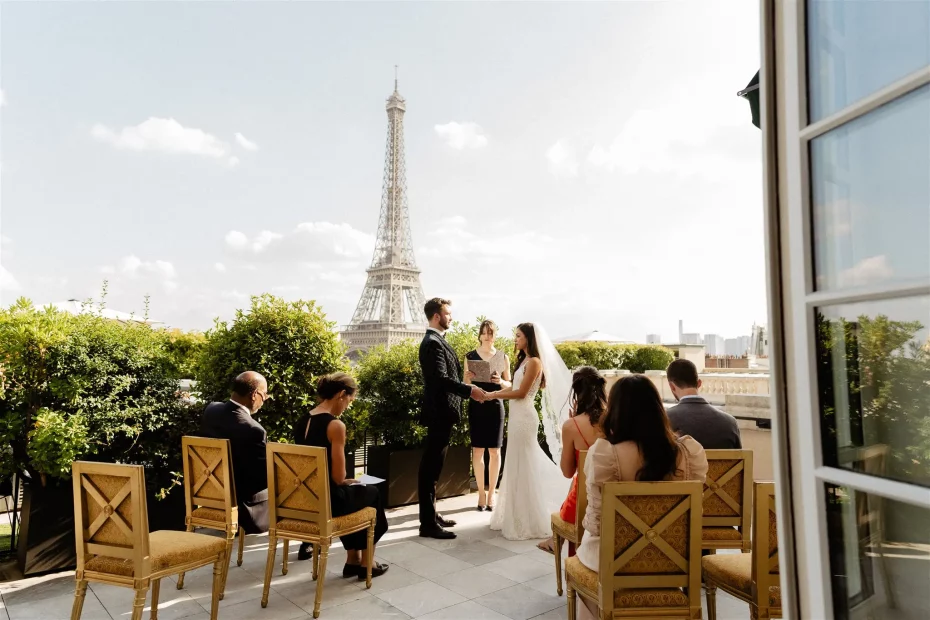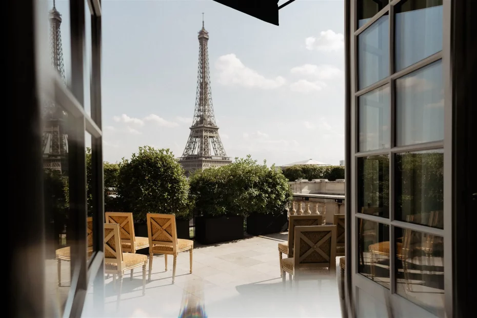 Inside, the palace feels equal parts royal and romantic — gilded salons, sweeping marble staircases, and chandeliers that make even the smallest moment feel cinematic. The hotel’s three grand reception rooms — the Grand Salon, Salle à Manger, and Salon de Famille — are among the most exquisite in the city, all classified as Monuments Historiques and linked by a private terrace with front-row views of the Eiffel Tower. Perfect for that “just married” champagne moment in the Parisian sky.