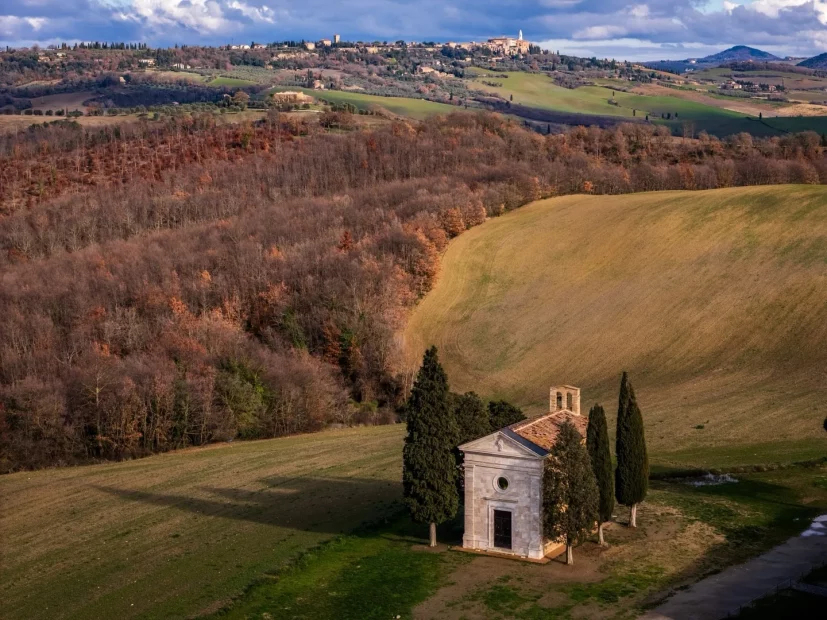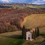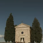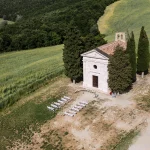 There are few silhouettes in Tuscany as recognisable as Vitaleta. Rising from the Val d’Orcia landscape with cypress trees standing to attention and rolling hills stretching quietly beyond, it feels almost cinematic in its poise. Yet standing within its grounds, the atmosphere is less spectacle and more stillness. The architecture is simple, timeworn and entirely at ease with its surroundings.