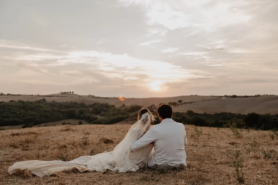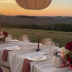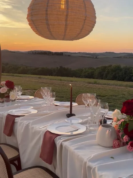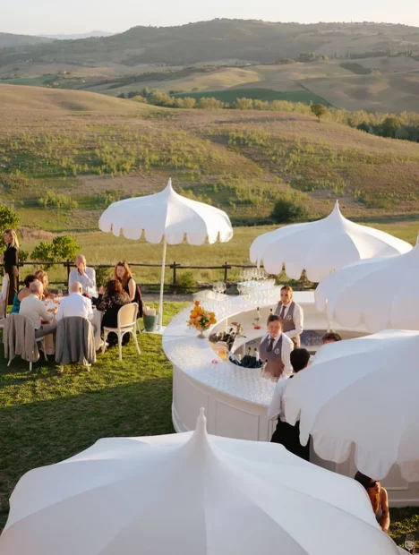 A golden hour aperitivo overlooking the Val d’Orcia landscape, when the light softens and the celebration begins to shift into evening.