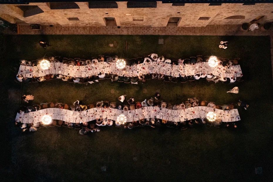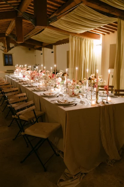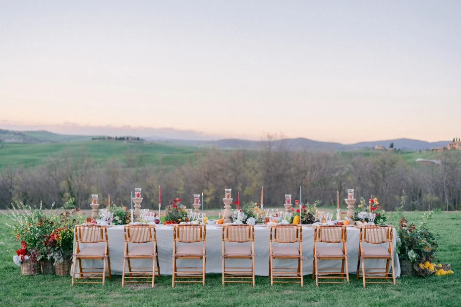 Hosting up to 200 guests, Vitaleta lends itself to celebrations that feel generous yet deeply connected to place. Ceremonies unfold against one of the most iconic backdrops in Italy, though the experience remains intimate rather than theatrical. Guests gather with uninterrupted views across the countryside before the day shifts naturally into dinner and dancing beneath open Tuscan skies. The setting requires very little embellishment; thoughtful styling and considered details are more than enough.