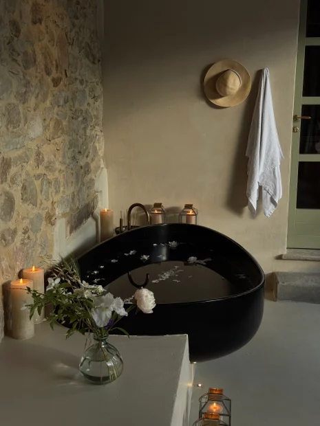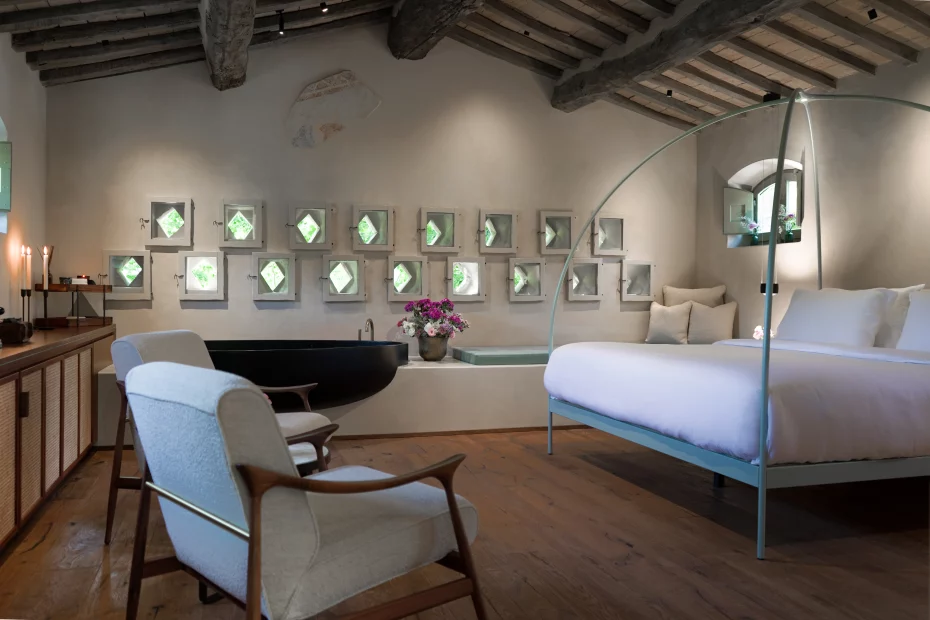 The property’s 12 rooms and suites, including a bridal suite and private spa suite each tell their own story. No two are alike; every space has its own colour palette, mood, and charm. Some open onto private terraces with outdoor bathtubs or secluded gardens, perfect for morning coffee or midnight stars. Across the Main Villa and Garden Annex, Italian craftsmanship takes centre stage – elegant, tactile, and timeless.